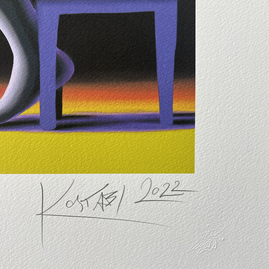 Fortemente ispirato da artisti come Giorgio de Chirico e Andy Warhol, ha fondato “Kostabi World,” uno studio che produce opere in collaborazione con altri artisti.