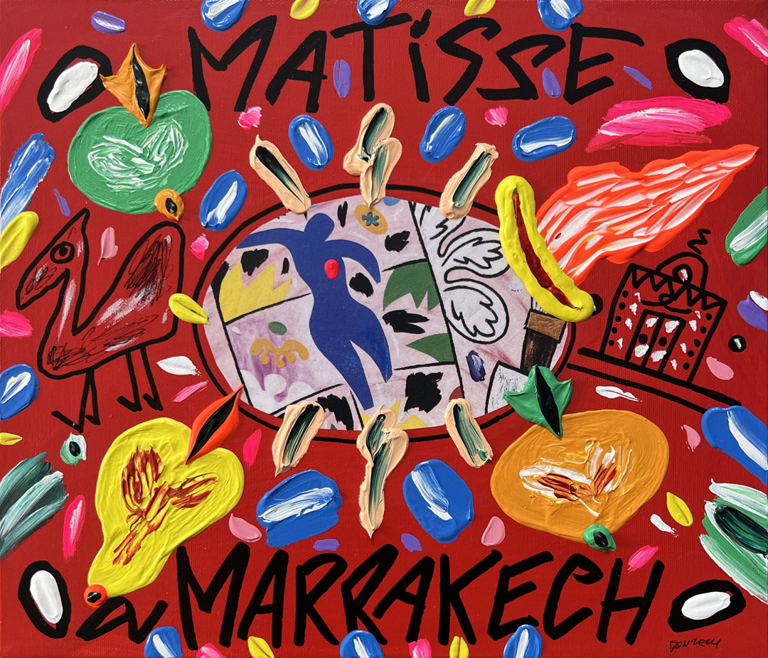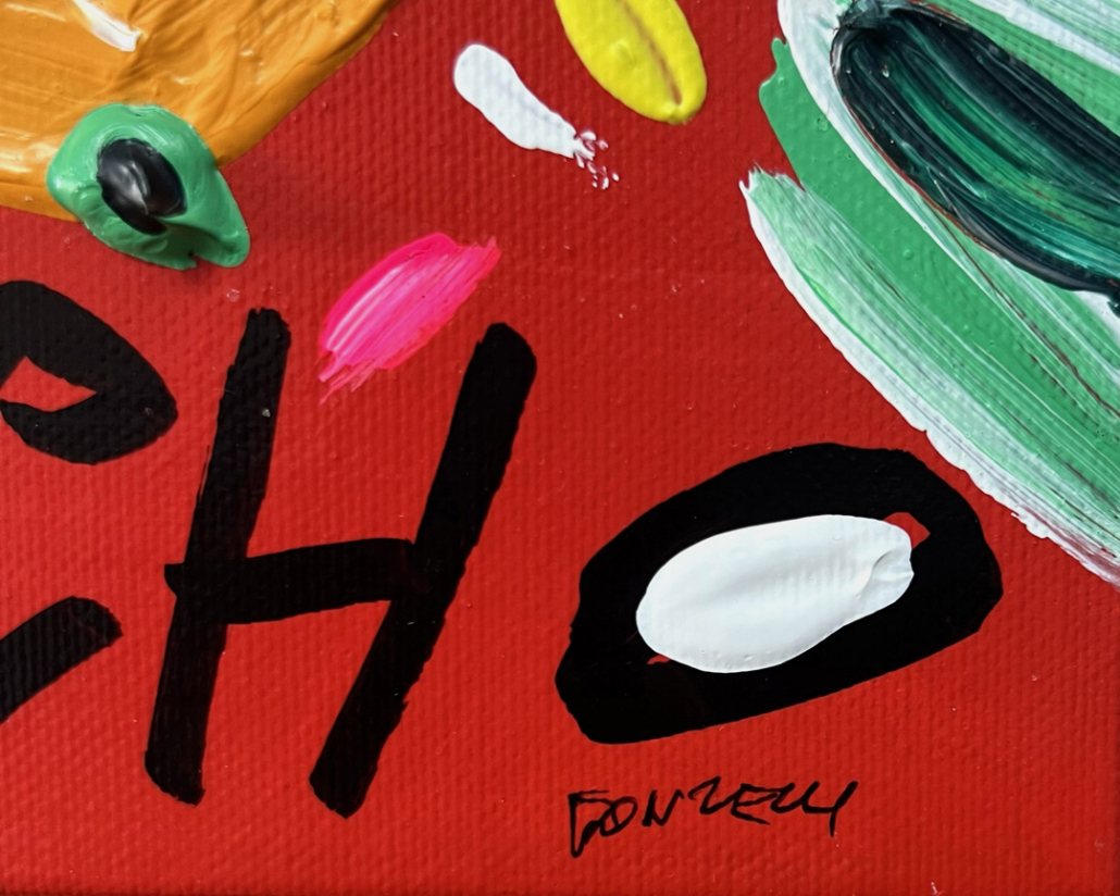 Influenzato inizialmente dal pop e dall’espressionismo, Donzelli ha sviluppato uno stile unico e colorato, con riferimenti giocosi e dissacranti ai grandi maestri del Novecento come Picasso, Warhol e Kandinsky.