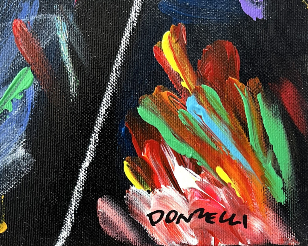 Influenzato inizialmente dal pop e dall’espressionismo, Donzelli ha sviluppato uno stile unico e colorato, con riferimenti giocosi e dissacranti ai grandi maestri del Novecento come Picasso, Warhol e Kandinsky.