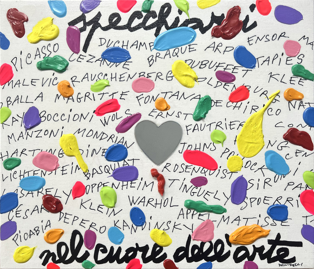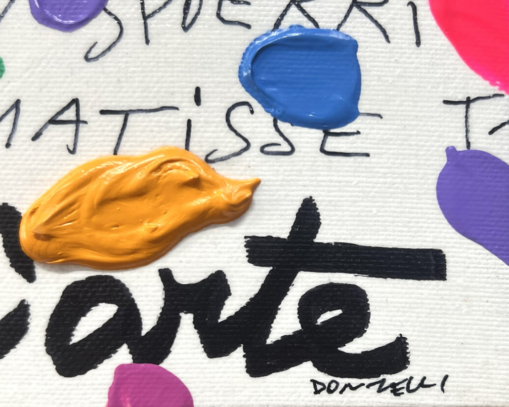 Influenzato inizialmente dal pop e dall’espressionismo, Donzelli ha sviluppato uno stile unico e colorato, con riferimenti giocosi e dissacranti ai grandi maestri del Novecento come Picasso, Warhol e Kandinsky.